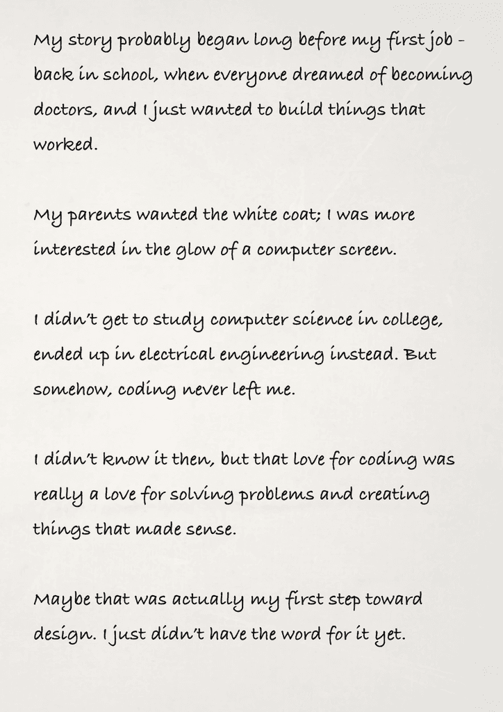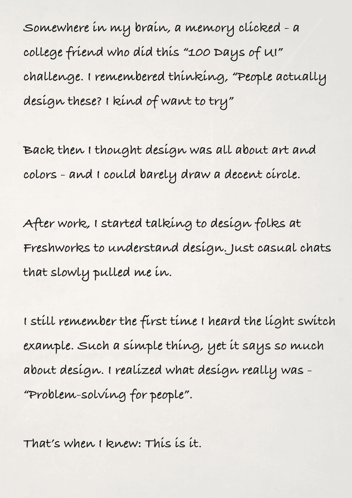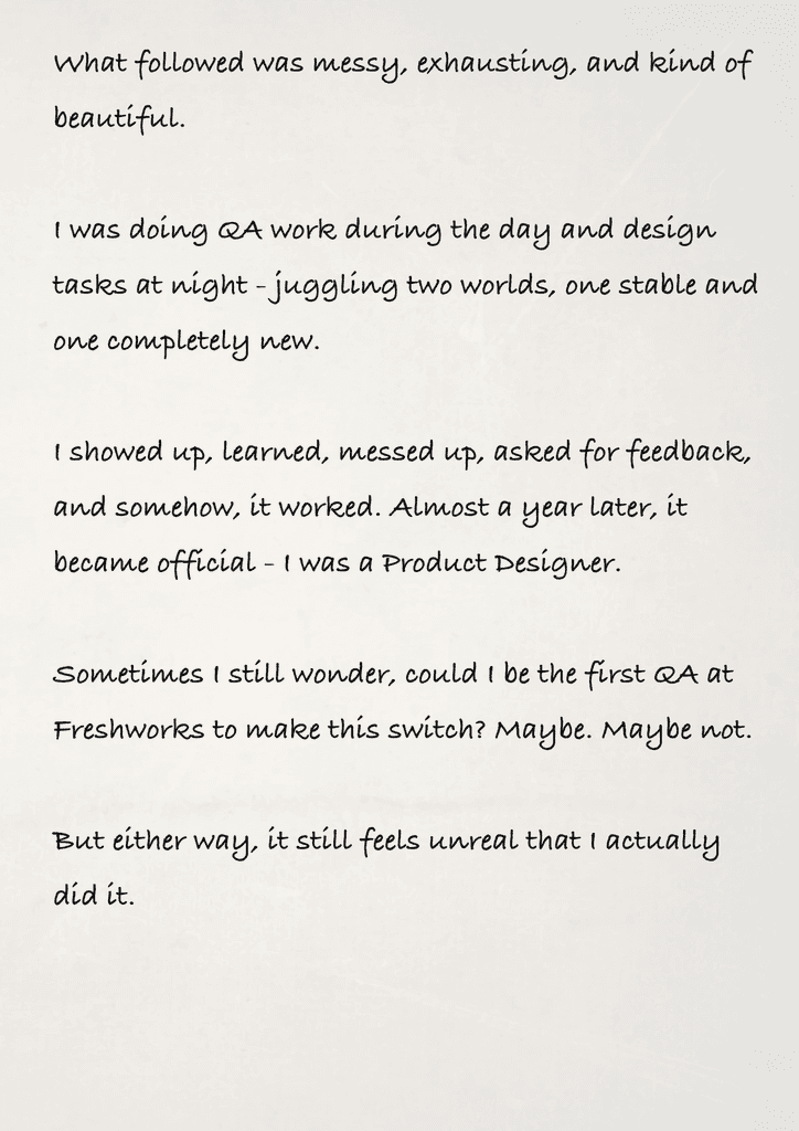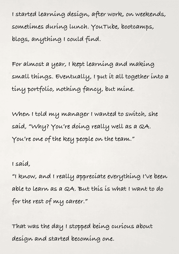 I quickly realized that I wanted to be part of building things than just making sure that they work. So I decided to learn design on my own and I made the switch