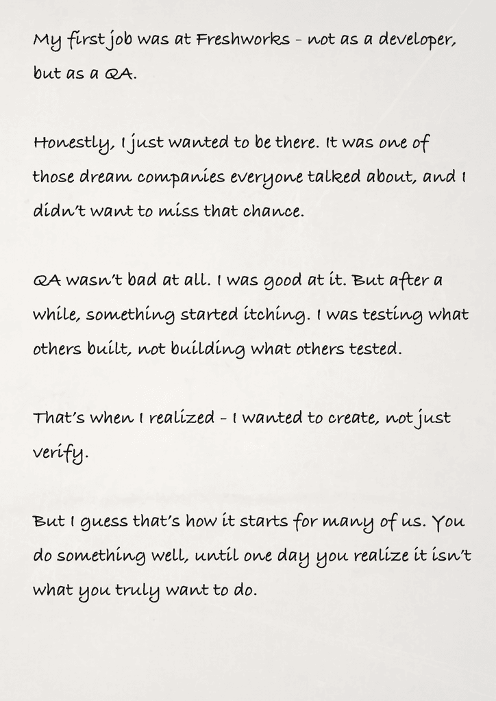 I started my career as Software engineer in test (QA). My love for coding got me into this role at Freshworks.